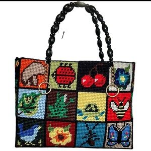 Vintage 70’s Grannycore handmade Needlepoint Handbag with Black Beaded Handles. This is an open tote bag with one slip pocket inside. This type of bag is often referred to as an "Ecology Needlepoint Bag". A charming vintage needlepoint and cross-stitch detailed handbag featuring a delightful tapestry of intricately stitched plastic grid squares, each displaying a different nature-themed motif, including mushrooms, flowers, ladybugs, frogs, and butterflies to name a few. The vibrant color palette of reds, yellows, blues and greens evokes a fun, naturist feel. Both sides shown. In excellent condition. Smoke-free home.
