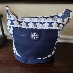 This beauty is a rare canvas Tory Burch whale tale bucket bag. The handle is made of rope adding to the nautical charm of the bag. She has a magnetic closure.