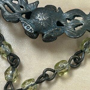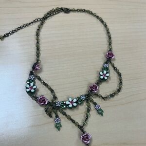 Charming Avon necklace with pink roses and green accents. Features intricate floral details. Perfect for adding elegance.