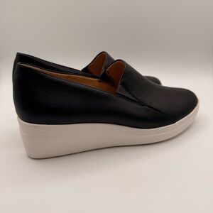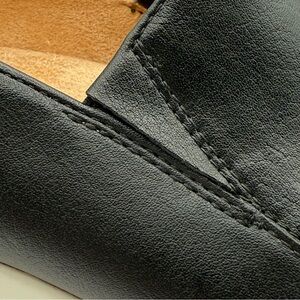 Elevate your style with these sleek black slip-on wedge shoes. Perfect for any occasion, they offer both comfort and elegance.