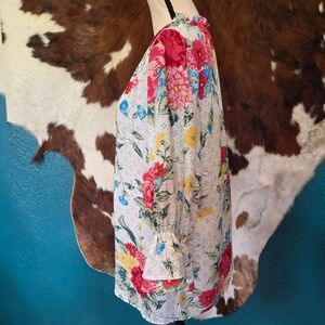 Charming blouse with vibrant floral patterns. Features pink and yellow flowers on a white base. Ideal for a fresh, stylish look. Lightweight fabric with bell sleeve style.