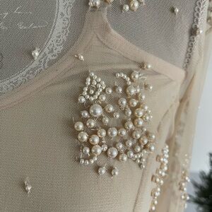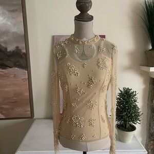 Stunning bodysuit by Free People. Sheer with camisole. Embellished all over with small and large pearls, even on the neck. Camisole snaps at the shoulders. Back zipper. Truly spectacular. Please note the stock image does not have the full camisole underneath like this one does, which provides better coverage as an under pinning.