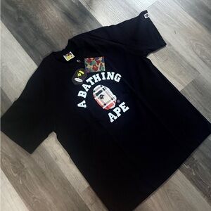 Shop this BAPE A Bathing Ape T-Shirt featuring the iconic Burberry-style plaid Ape Head logo on a black short sleeve tee. This exclusive graphic is paired with a multicolor camo tag, making it a must-have for streetwear collectors and Bape fans