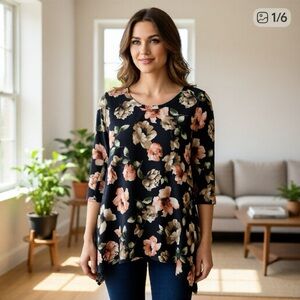 Embrace a chic look with this floral print tunic top. The blend of colors adds a touch of elegance to your wardrobe. Perfect for Fall with a black leggings. In excellent pre-loved condition No flaws