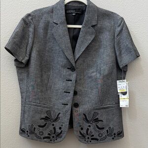Chic charcoal suit with short sleeves. Black floral accents on hem. Ideal for office wear.