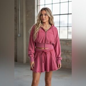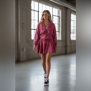 This hoodie is crafted from soft french terry with acid wash. It features a functional drawstring hood, front patch pockets, and a full zip-front closure. The cut is a cropped, boxy fit with drop shoulders, and a wide, cinched ribbed hem. Pair with matching skirt for a coordinated athleisure look.