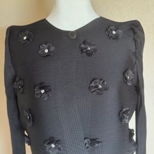 This chic black top features delicate floral embellishments, perfect for adding a touch of elegance to any outfit. Ideal for both casual and formal occasions.