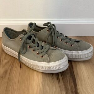 GUC Olive leather sneakers with classic lace-up style. Ideal for everyday wear. Some small spots on the inner side of both shoes shown in pictures.