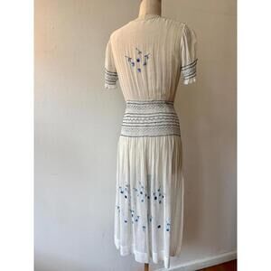 The loveliest semi sheer white cotton voile with bright ombre blue cotton embroidery. Short puff sleeves with ombre embroidered stretch smocking on sleeves and waist. Small snaps that open up on side. No label, circa 1930s.
