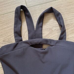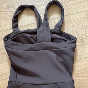 Thrive Societe Brown sleeveless active wear dress with crisscross detail in the front. Built in bra with removable padding. Built in spandex shorts.