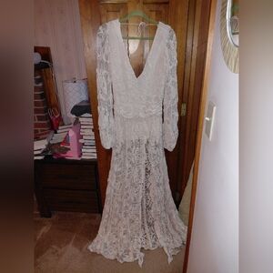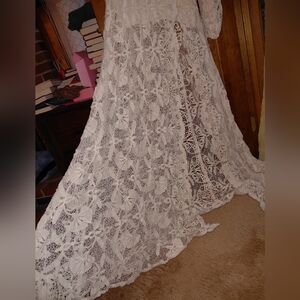 Step into elegance with this stunning white lace maxi dress. this dress features intricate lace detailing and a flattering silhouette. Ideal for making a statement.