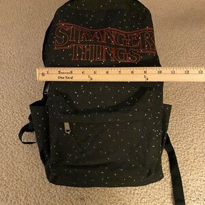 Bold black backpack with red Stranger Things design. Perfect for fans. Spacious and stylish.