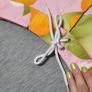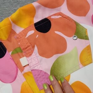 Made of Quality Swimsuit Fabric in a Bright 70's Style Floral Pattern of Pink, Orange, Green, Black & White w/ White Yarn Bow-Tie Front & Silver-Toned Rivets