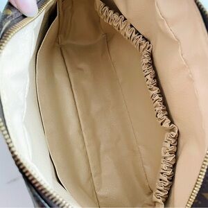Louis Vuitton signature brown monogram coated canvas with an ivory waterproof pvc interior. The clean interior has a slip pocket and 3 bunched elastic holds. No visible discoloration or stains.