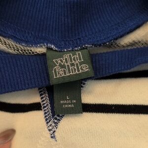 Stylish tee with blue and black stripes. Features a blue neckline.