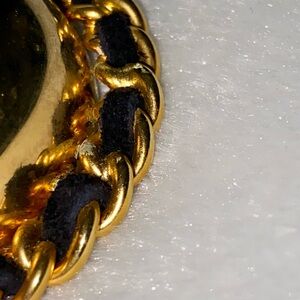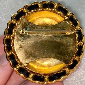 Vintage, Chanel inspired gold-tone chain brooch. Features a gold chain woven with black fabric, which is a signature style often associated with Chanel, particularly their vintage costume jewelry from the 1980s and 1990s. This piece does show signs of wear.