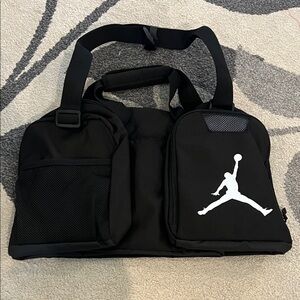 Sleek black duffel bag with iconic white Jordan logo. Ideal for gym and travel. Comfortable straps and spacious interior.