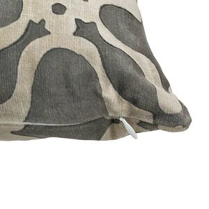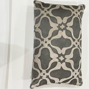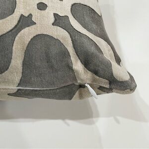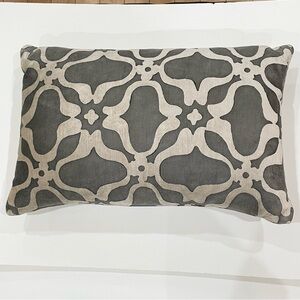 Beautiful hand block print accent pillow in velvety fabric by Galbraith & Paul I had custom made from Room & Board for a sofa I purchased there. The gray and cream design complements any decor. Pillow is firm. Check labels on both actual pillow materials, size and pillow cover.