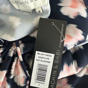 NWT SACHIN + BABI Melody Dress Ikat Blue/ Pink Midi Casual Cutout Puff Sleeve 2