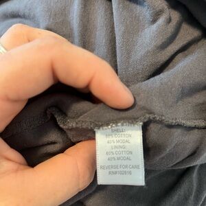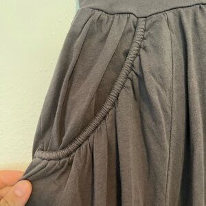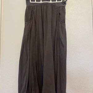 A super comfortable boho maxi skirt in a dark gray color. The back has a bubble skirt detail and the pockets have a super cute rolled edge. It’s very soft and would be perfect for fall. There are two tiny holes on the right hip as shown.