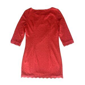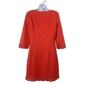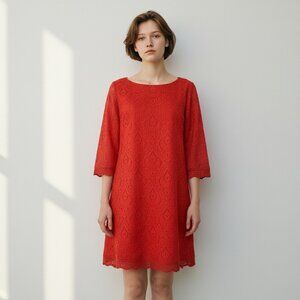 London Times Red Eyelet Lace Shift Dress Boat Neck 3/4 Sleeves Size 8 Petite