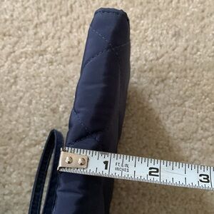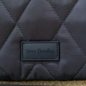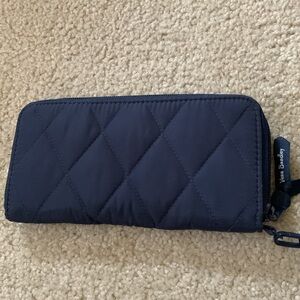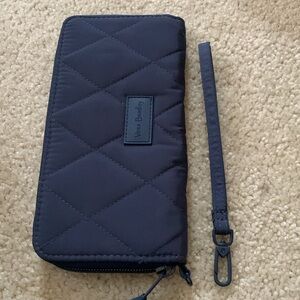Stylish blue quilted wallet/wristlet with zipper closure by Vera Bradley. Interior features: four open pockets, eight credit card slots, photo ID clear slot, center zipper compartment. Pretty interior flower print. New without tags. Measures 8”length x 4”height x 1/2”width. Removable wristlet strap.