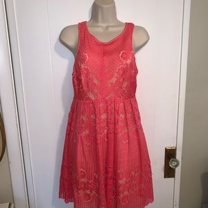 A vintage-inspired Free People dress detailed with charming lace. Gentle pleating and a scalloped hem add a sweet look, while a cutout back finishes the flirty silhouette. Lined. salmon pink dress
