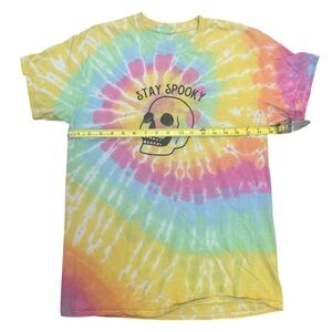 Brighten up your wardrobe with this vibrant tie-dye t-shirt featuring a fun 'Stay Spooky' design. Perfect for playful days. Tags have been cut off, so see images for measurements.