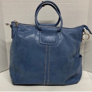 Elegant tan leather satchel by HOBO. Features dual handles and a removable strap. Perfect for everyday use.