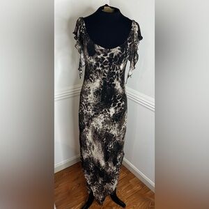 Eye-catching maxi dress with vibrant patterns. Features striking Orange and purple hues. Perfect for making a statement.