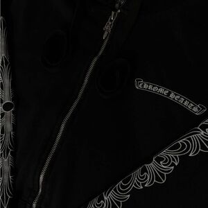 Stylish black hoodie featuring intricate white designs on the sleeves. Chrome Hearts branding on the chest. Comfortable and lightweight.