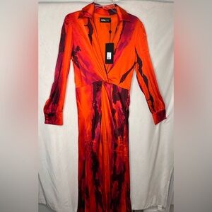 Make a statement with this vibrant long sleeve dress. Bold red and purple hues. Perfect for any event.
