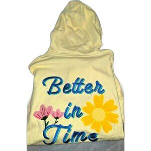 Yellow hoodie featuring colorful floral embroidery and 'Better in Time' text. Brand new with tags.