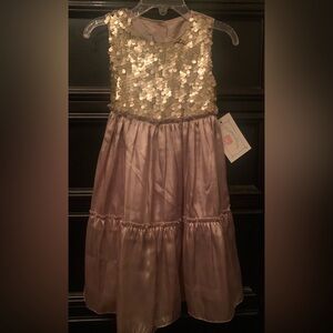 This elegant pink dress features a beautifully knit top with floral details, ideal for special occasions. The flowing skirt adds a graceful touch.