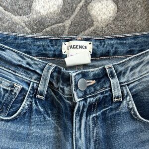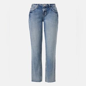 The quinessential casual look holds its shape, gently hugging just below the natural waist and through the hip before falling in a straight leg to a raw hem.