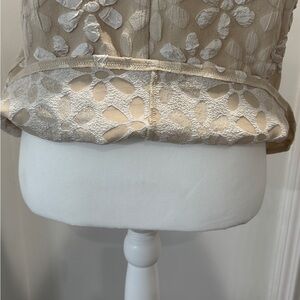 This elegant beige and white top features intricate floral embroidery, perfect for adding a touch of sophistication to any outfit. The fabric and delicate design make it a versatile choice for both casual and formal occasions.