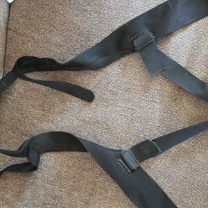 Durable harness with black straps and red edging. Secure buckles ensure a snug fit.
