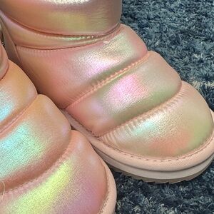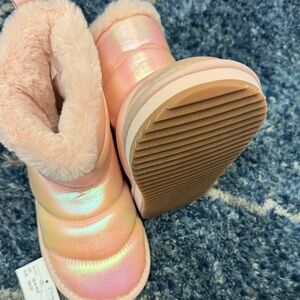 HELLO KITTY stylish iridescent pink kids boots are perfect for keeping little feet warm and fashionable. The soft, plush lining ensures comfort, while the shimmering exterior adds a touch of fun to any outfit. I think they run just a tiny bit smaller because my daughter was a 13 at the time and they fit very snug just FYI that is the reason why she could not wear them.