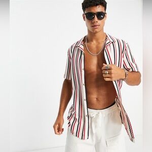 Charming blue button-up shirt with adorable dog print. Perfect for casual outings. Lightweight with very short sleeves.