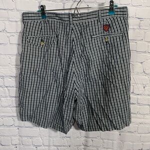Mens vintage shorts in a plaid check pattern. Front zip closure with front and back pockets. Back pockets have button closure. Back Logo patch.