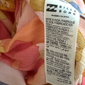Chic Billabong kimono with floral design. Features a blend of pink, yellow, and orange tones.