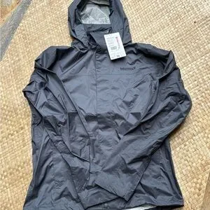 Lightweight steel grey rain jacket by Marmot. Ideal for outdoor activities.