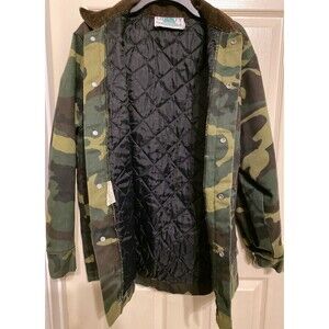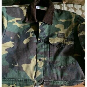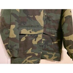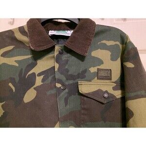 Vintage Liberty Woodland Camouflage Chore Coat Jacket in a mens size medium regular. WPL 5802 - Fits about 38/40 chest. Made in the USA with a cotton blend outer shell material, (58% Cotton / 50% polyester) this jacket has a button closure, making it a comfortable and practical choice for casual and outdoor wear. It has a nylon quilted lining design. The Liberty brand logo is on the front. Machine washable, this jacket is a timeless versatile addition.