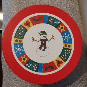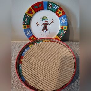 Very festive set of 4 plates with snowman design edged with brightly colored Christmas-themed symbols. Plates are titled Country Christmas by Riviera Van Beers and measure 7.5 inches across. Round red container holds all plates with cardboard dividers to keep them safe. Brand new condition - possibly never used.