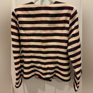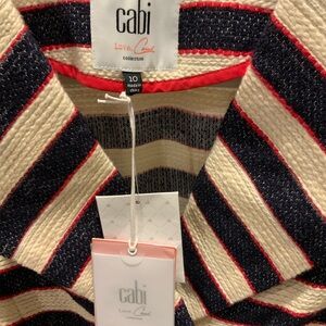CAbi striped cruise unlined navy, red, and cream blazer jacket #5094; NWT; Love, Carol Collection; double-breasted buttons down front; v-neck; lightly padded shoulders; 3 buttons at sleeves; 55% cotton, 45% polyester; dry clean only; comes with extra buttons; 10