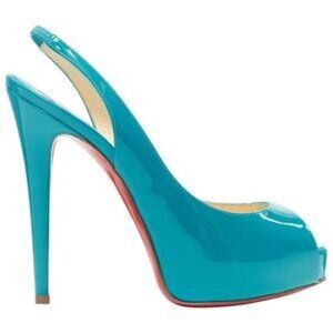 These stunning pumps are crafted of glossy patent leather in teal. They have a sharp 5 inch stiletto, a peep toe, 1 in hidden platform and a classic slingback heel. These are gorgeous pumps for a distinctive look from Christian Louboutin.