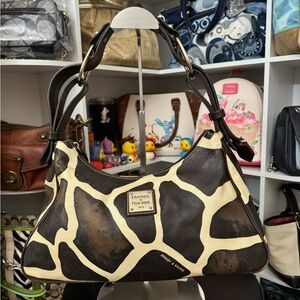 Chic black satchel with vibrant multicolor logo pattern. Features sturdy handles and adjustable strap. Ideal for everyday use. You can carry this with the crossbody strap or the handles!