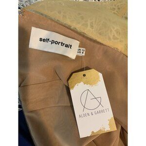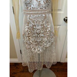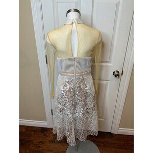 Self-Portrait White Lace Tan Mesh Collared Long Sleeve Fit & Flare Dress, Size 8