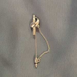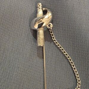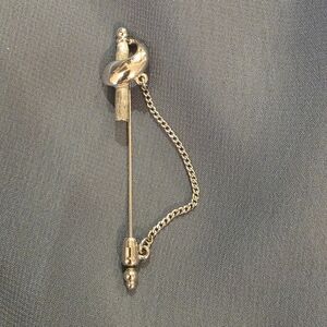 Beautiful vintage Monet silver-tone tie pin/stick pin brooch featuring a sleek design and attached chain. Perfect for formal occasions.