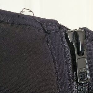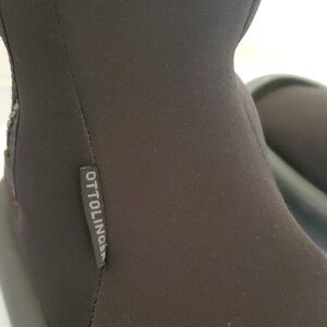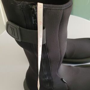 Sleek black boots with side zippers. Velcro closure at cald for snug fit. Right boot has small loose stitching. Modern design. Comfortable fit.